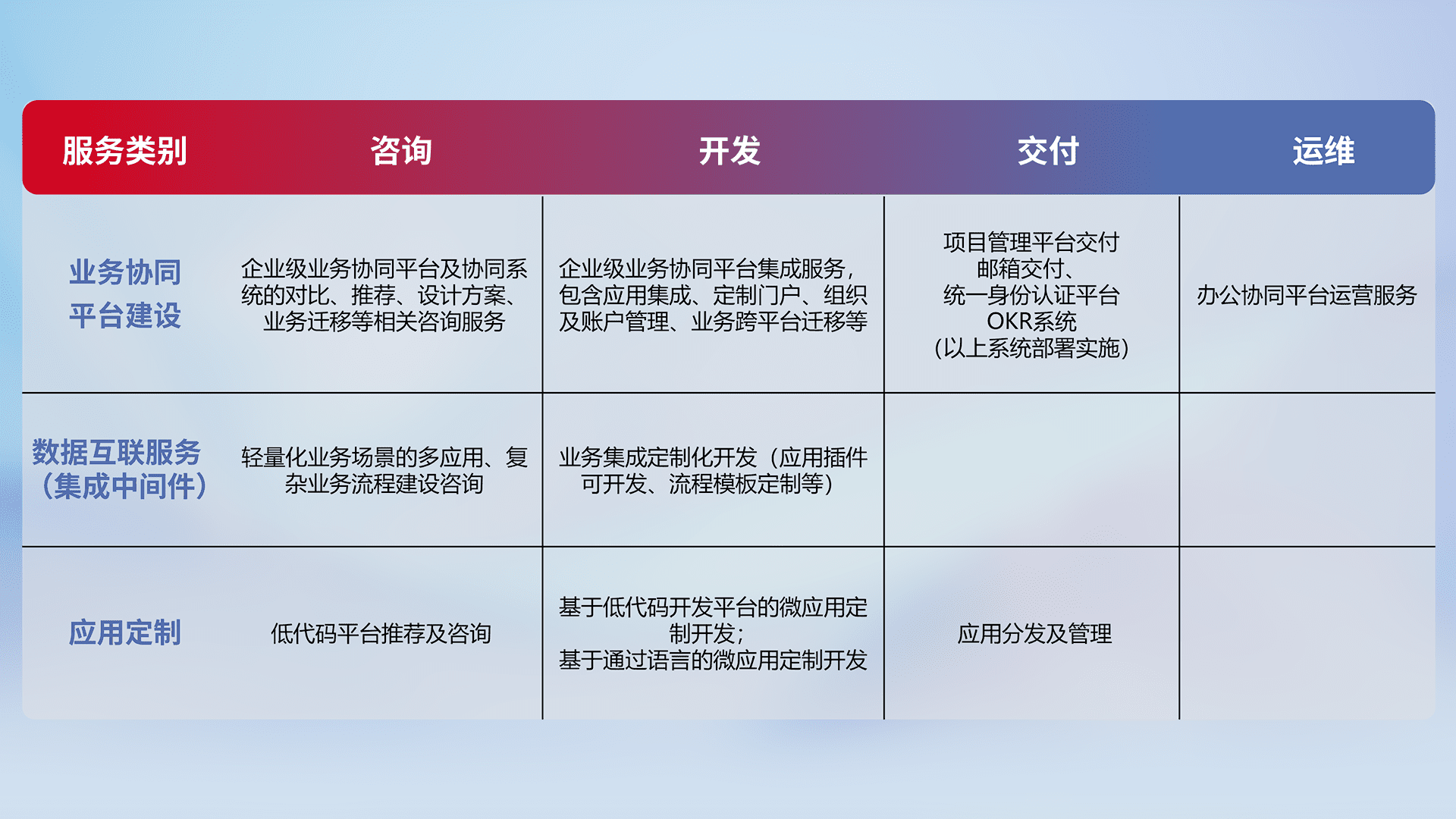 针对钉钉、、、企微、、IDaas等平台级产品提供产品的规划、、、、方案、、交付、、定制化开发等服务,,,,实现如统一协同办公、、、、智能客户服务、、、混合会议管理、、、智能数据查询、、等业务场景,,实现数字化转型。。。。
