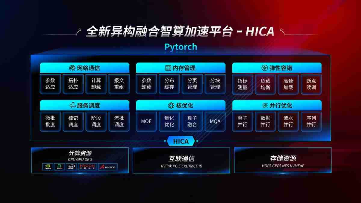 通过自研的服务层、、、、中间适配层、、以及调度编排算法,,采用数据并行、、、模型并行等多种并行方式,,,,把并行计算任务进行有效的分解,,,使其分别由相应的软件栈和算力资源来承接。。。。当GPU资源变化,,HICA可以实时动态调度计算子任务并调整模型拓扑和架构,,以充分聚合各种算力资源。。。。