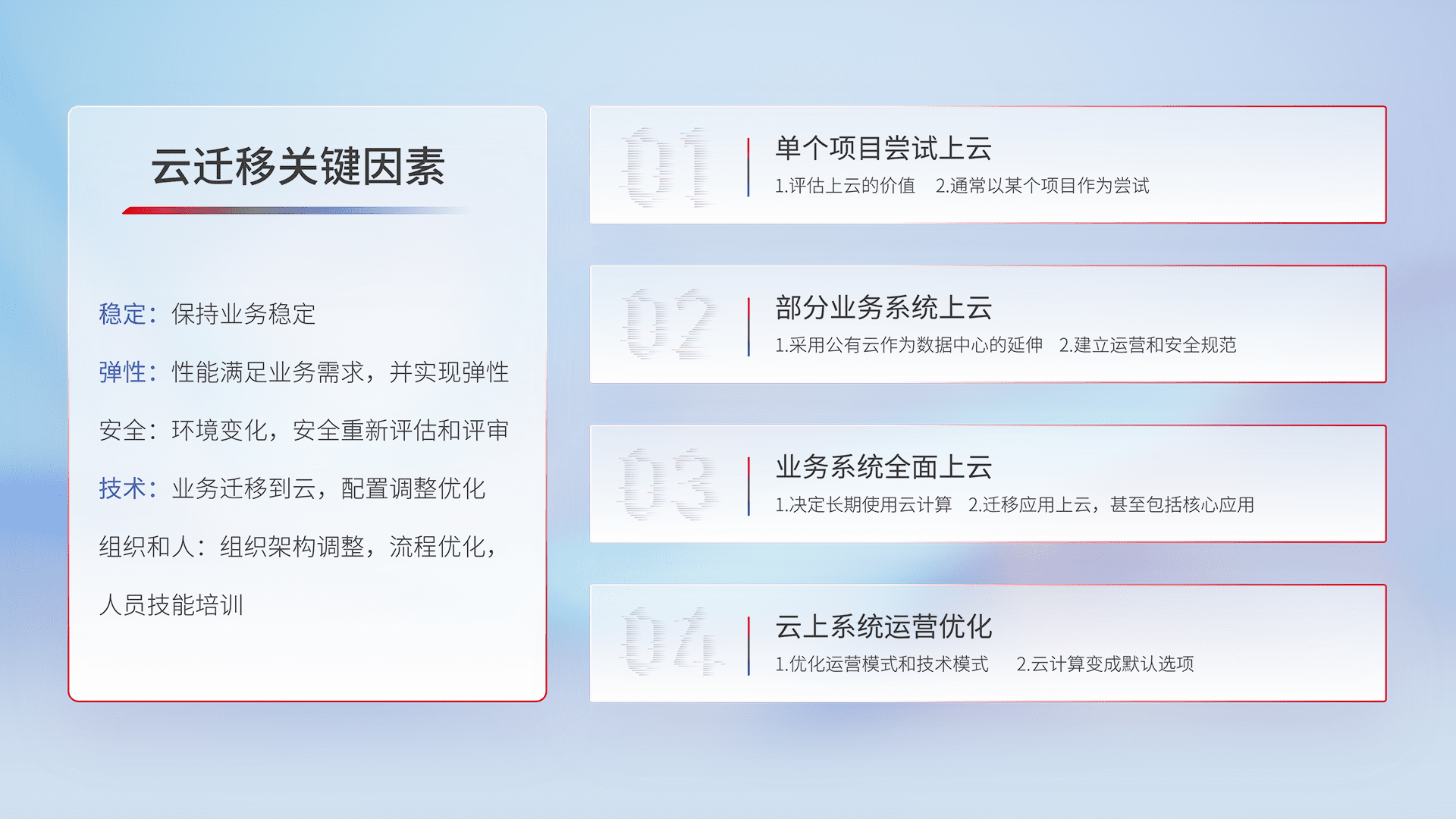 结合实际业务,,,从规划设计、、、云平台选型、、、、云原生改造、、、数据迁移、、、、集成交付,,迁移全过程为客户识别最佳上云路径,,,做好风险识别管理,,,设计网络架构、、身份权限、、、、安全审计合规、、操作审计、、、、日志审计、、监控告警策略、、、多站点容灾设计等,,,,对云上基础设施进行整体规划,,,提升IT治理水平,,以满足弹性、、、高可用、、高性能的需求。。。。