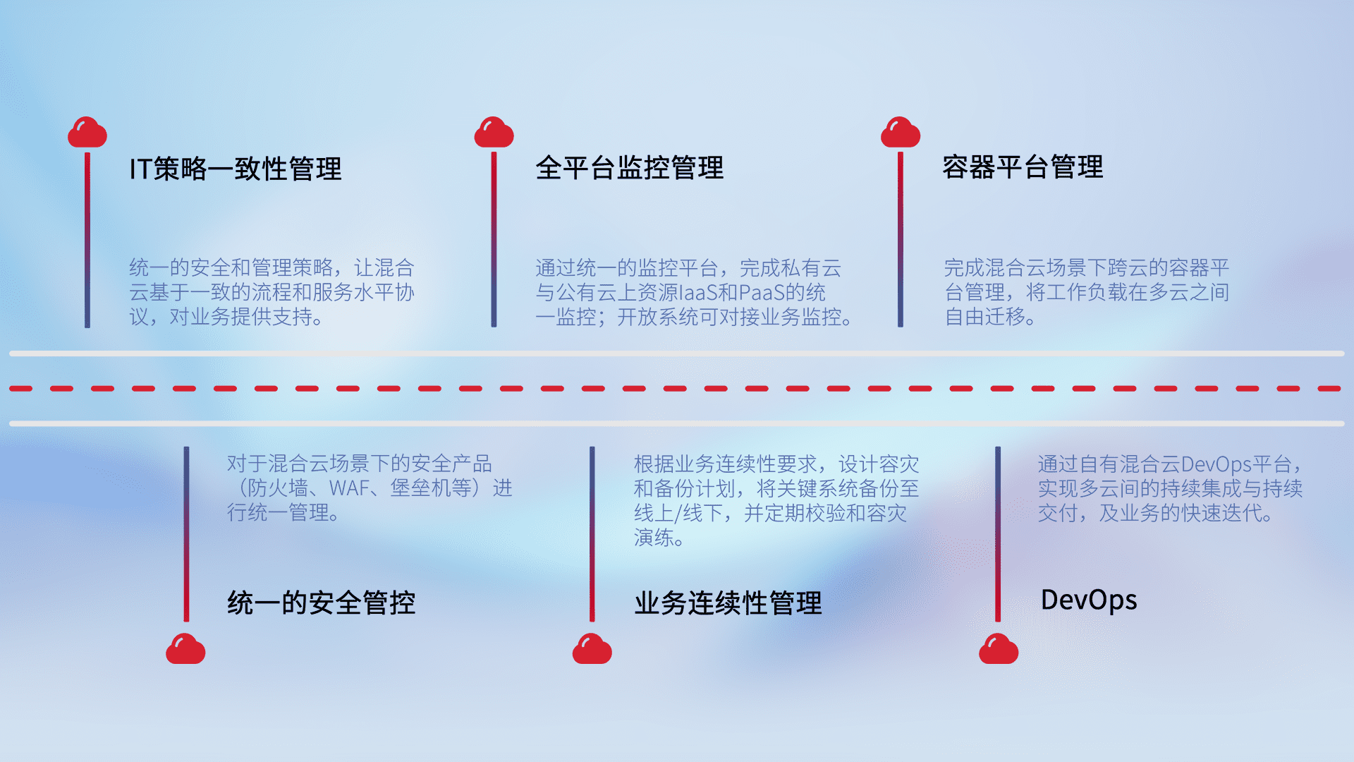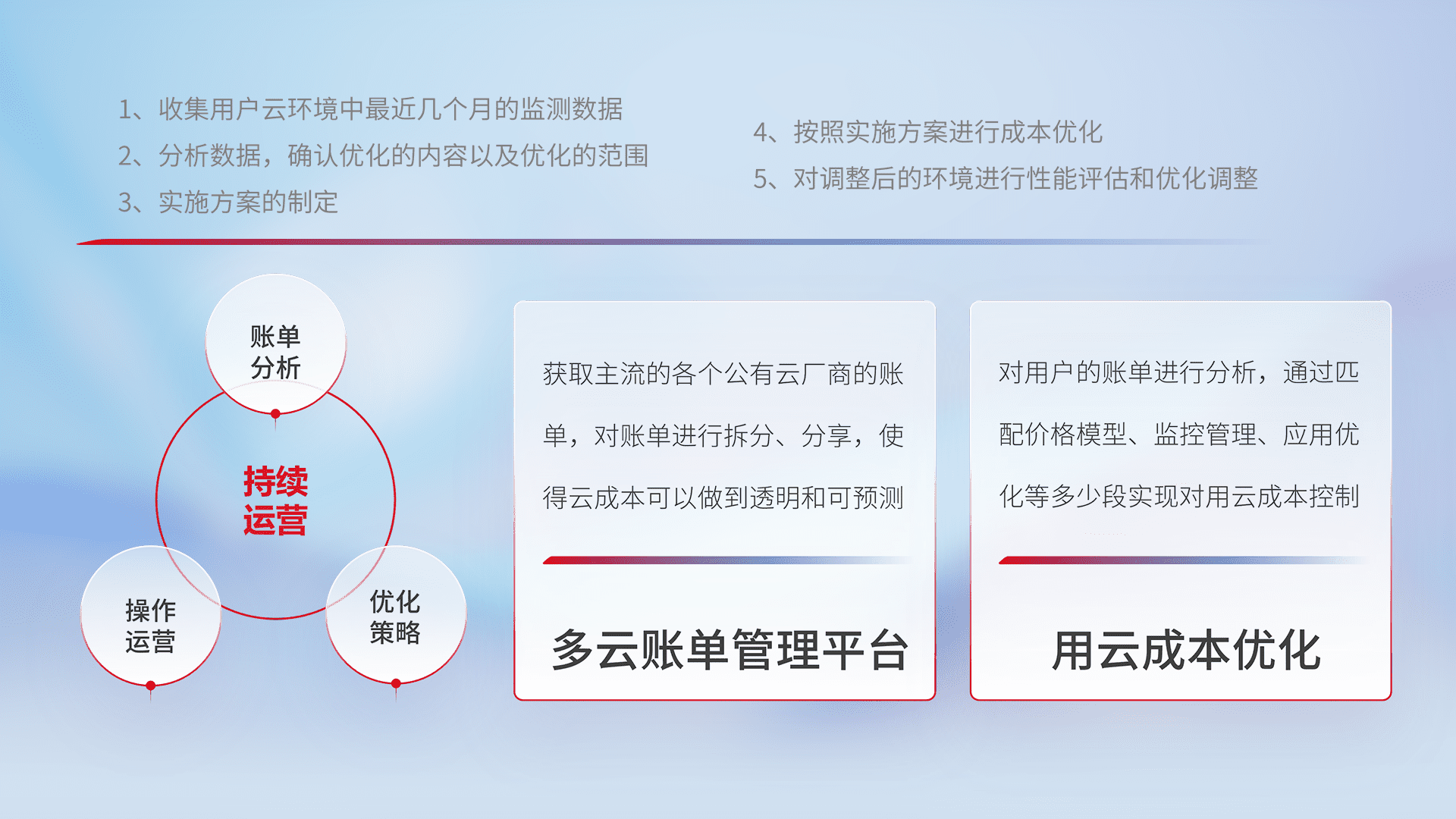 通过多云纳管,,,,以统一的资源数据模型把客户的云资源进行抽象和封装,,,,进而实现对多云资源的统一操作,,保障云资源管理的可靠性、、稳定性与可用性。。。量身定制化运维内容,,,,配置、、开发运维、、、补丁管理、、、备份、、、监控、、认证和访问管理、、、审计和日常巡检等,,保障在用云过程中的可靠度,,稳定度以及高可用率。。。